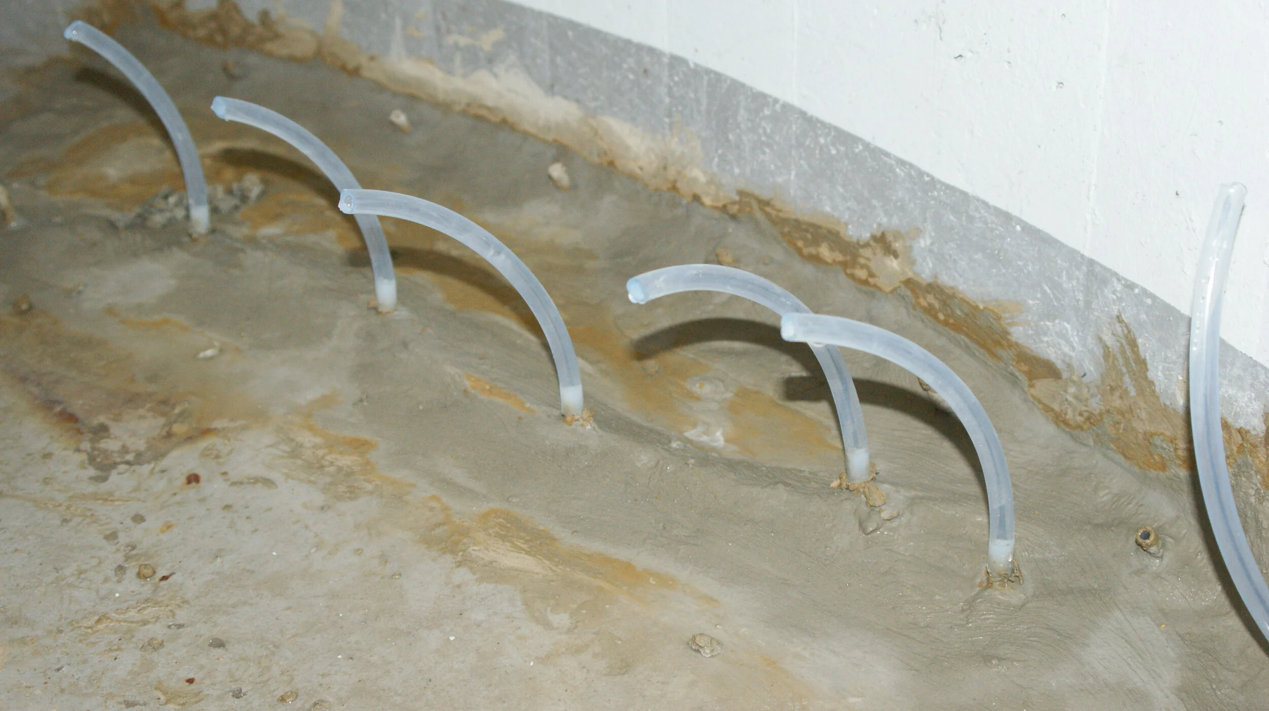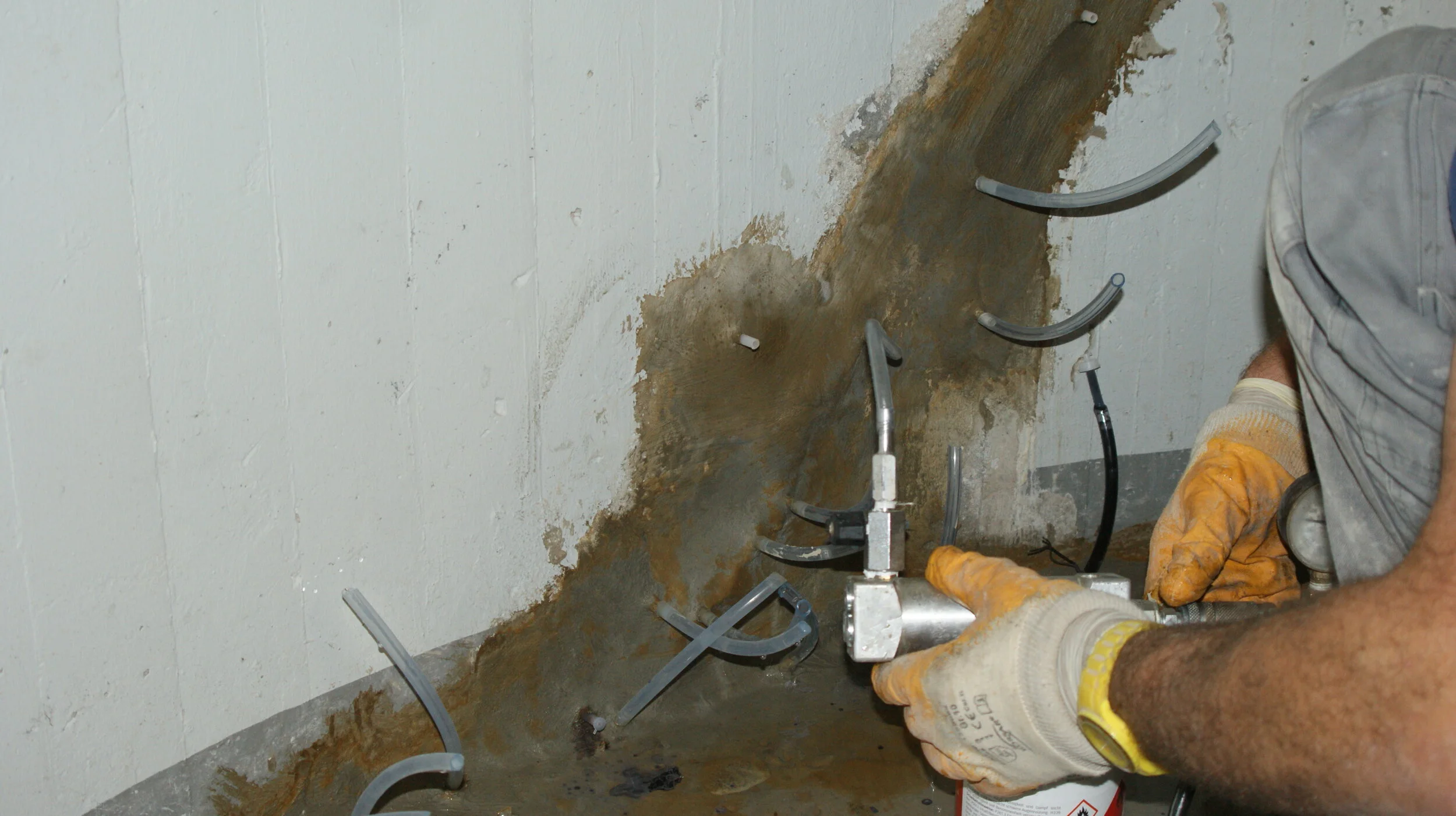 Die partiellen Fließstellen wurden ebenfalls unter Verwendung von Injektionsharz saniert. Dazu wurde im Wasseraustrittsbereich eine Kernbohrung hergestellt, in die eine Dichtscheibe mit angeschlossenem Spezialinjektionsschlauch eingebaut wurde. Über diesen Schlauch wurde schließlich das Harz injiziert, bis die so geschaffene Injektionskammer vollständig gefüllt und der Druck der Injektionsanlage konstant war. Auf diese Weise konnte CSE Construction auch diese Problembereiche erfolgreich behandeln.