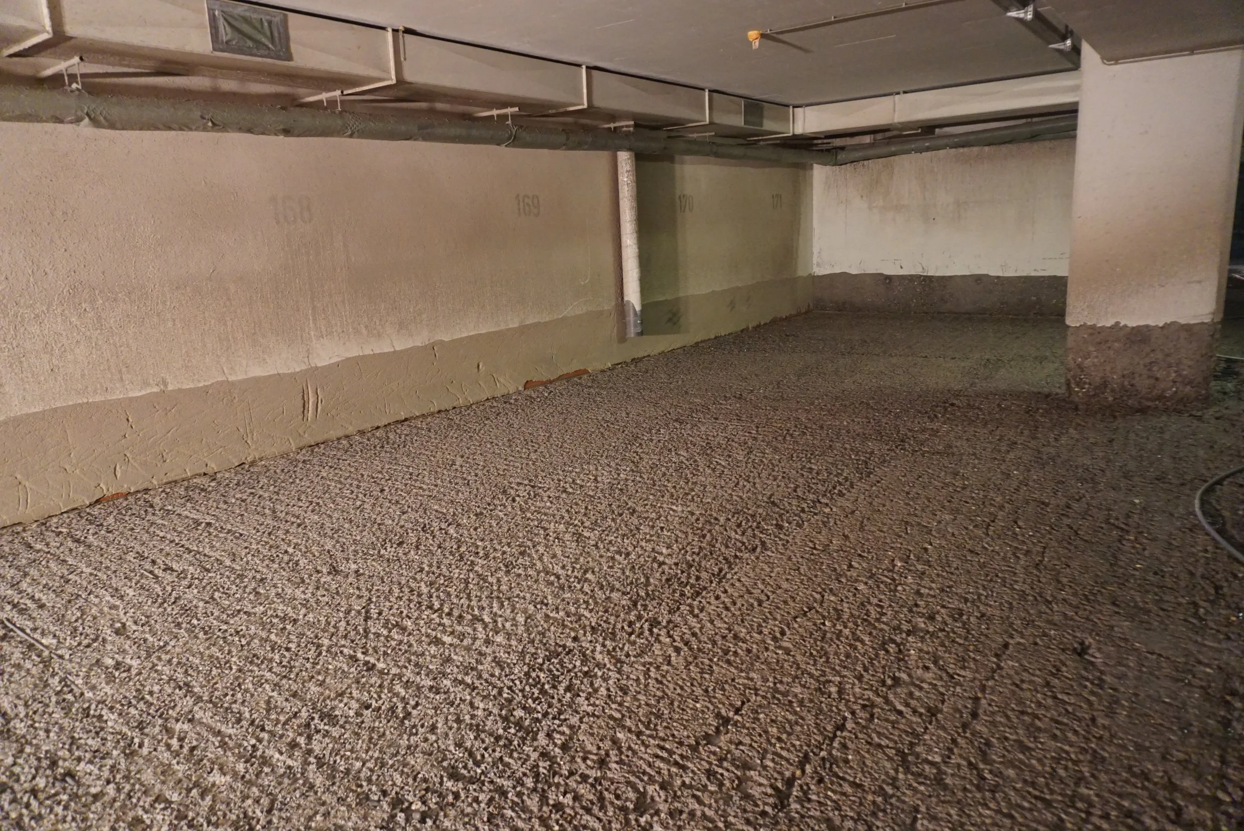 Das 1. Untergeschoss, welches auschließlich privat genutzt wird und die ersten beiden Bauabschnitte umfasst, startete Anfang Oktober 2020. Insgesamt wurden bis Mitte Dezember knapp 200 Tonnen Gussasphalt ausgebaut und ca. 30 Kubikmeter Beton durch Höchstdruckwasserstrahlen entfernt. Dies entsprach einem Betonabtrag von bis zu acht Zentimetern an der zum Teil stark geschädigten Zwischendecke. Im Anschluss wurden auf 1.850 Quadratmetern knapp 3-5 Zentimeter PCC I (RM) eingebaut. An den Sockelflächen wurde die Bewehrungsüberdeckung mit PCC II (RM) erhöht. Es wurden zahlreiche Risse bearbeitet, Entwässerungen installiert und Fugen mit Profilkonstruktionen erneuert. Pünktlich zu den Feiertagen und dem Jahreswechsel wurde die Tiefgarage temporär für die Nutzung freigegeben. Im Januar 2021 begann mit der Endbeschichtung des 1. Untergeschosses der zweite Bauabschnitt. Die gesamten Decken-und Wandflächen wurden mit einem OS 2 Anstrich versehen. Die 1.850 Quadratmeter Bodenflächen wurden mit einem rissüberbrückenden OS 8 ausgeführt und die Parkflächen dabei farblich abgesetzt.