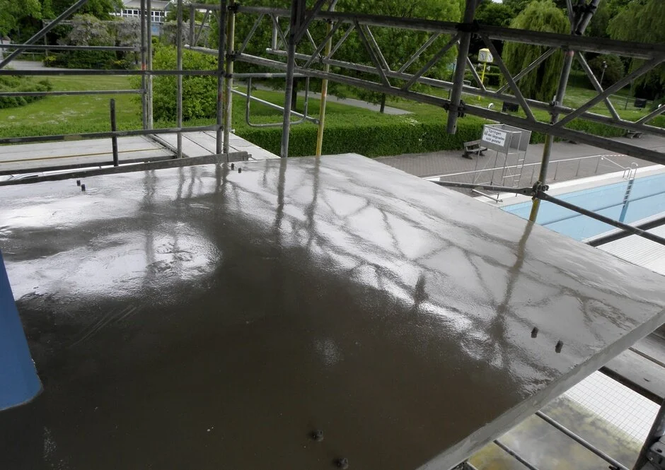 CSE wurde von den Berliner Bäder-Betrieben mit Betonsanierungsmaßnahmen am Sprungturm beauftragt. Die vorbereitenden Arbeiten dieses Bauvorhabens umfassten vor allem verschiedene Demontagearbeiten. So mussten zunächst Geländer, Leitern und die Sprungbrettanlage entfernt werden. Darauf folgte die Untergrundvorbereitung mittels Sandstrahlen. Nach ausführlicher Prüfung der vorhandenen Betonflächen, u.a. auf Carbonatisierungstiefe und Schadstoffbelastung, wurden zahlreiche Fehlstellen aufgemörtelt.